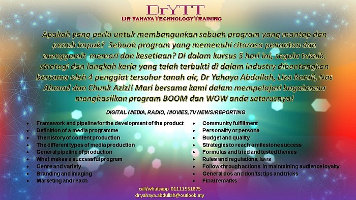 Apakah yang perlu untuk membangunkan sebuah program yang mantap dan penuh impak? Sebuah program yang memenuhi citarasa penonton dan menggamit memori dan kesetiaan? Di dalam kursus 5 hari ini, segala teknik, strategi dan langkah kerja yang telah terbukti di dalam industri dibentangkan bersama oleh 4 penggiat tersohor tanah air, Dr Yahaya Abdullah, Nas Ahmad, Lixa Ramli dan Chunk Azizi! Mari bersama kami dalam mempelajari bagaimana menghasilkan program BOOM dan WOW anda seterusnya!