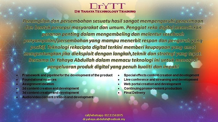 Penampilan dan persembahan sesuatu hasil sangat mempengaruhi penerimaan dan bentuk persepsi masyarakat dan umum. Penggiat reka digital memainkan peranan penting dalam mengembeling dan melentur sesebuah penyampaian/persembahan yang mampu menerbit respon dan pengaruh yang positif. Teknologi rekacipta digital terkini memberi keupayaan yang amat menguntungkan jika dieksploit dengan langkah,teknik dan strategi yang tepat. Bersama Dr Yahaya Abdullah dalam memacu teknologi ini untuk mencapai pengeluaran produk digital yang penuh kualiti dan impak!