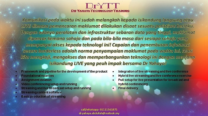 Komunikasi pada waktu ini sudah melangkah kepada isikandung langsung atau LIVE dimana pemancaran maklumat dilakukan disaat sesuatu peristiwa berlaku. Dengan adanya peralatan dan infrastruktur sebaran data yang tinggi, maklumat dipancar kemana sahaja dan pada bila-bila masa dari sesiapa sahaja yang mempunyai akses kepada teknologi ini! Capaian dan penembusan informasi secara borderless adalah norma penyampaian maklumat pada waktu ini. Mari kita mengkaji, mengakses dan memperbangunkan teknologi ini dengan menjana isikandung LIVE yang penuh impak bersama Dr Yahaya!