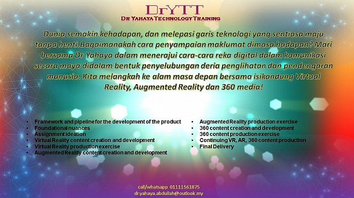 Dunia semakin kehadapan, dan melepasi garis teknologi yang sentiasa maju tanpa henti.Bagaimanakah cara penyampaian maklumat dimasa hadapan? Mari bersama Dr Yahaya dalam menerajui cara-cara reka digital dalam komunikasi secara maya didalam bentuk penyelubungan deria penglihatan dan pendengaran manusia. Kita melangkah ke alam masa depan bersama isikandung Virtual Reality, Augmented Reality dan 360 media!